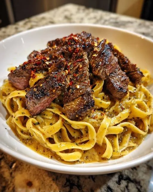 This indulgent pasta dish combines pan-seared Cajun-seasoned steak with a garlic butter base and a luscious Parmesan cream sauce. It’s quick enough for weeknights and fancy enough for guests.