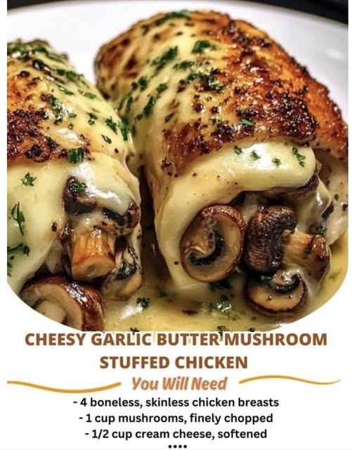 This dish combines the rich flavor of garlic butter mushrooms, gooey melted cheese, and tender pan-seared chicken breasts for an irresistible meal. The inside is creamy and savory, while the outside gets a perfect golden crust. Serve it with mashed potatoes, pasta, or roasted veggies.
