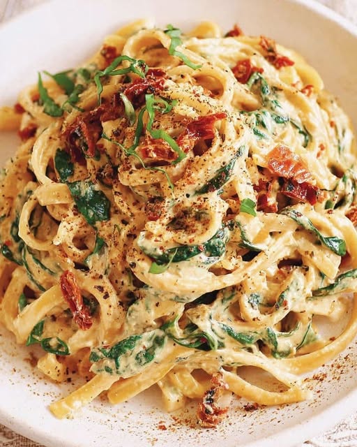 This Creamy Spinach and Sun-Dried Tomato Pasta is the perfect weeknight comfort dish—warm, garlicky, and full of bold Mediterranean flavors. The sun-dried tomatoes add a sweet-tart punch, spinach brings freshness, and the creamy Parmesan sauce ties it all together. It’s vegetarian, filling, and ready in under 30 minutes.