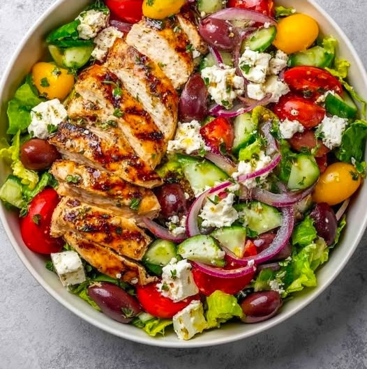 This Grilled Chicken Greek Salad Bowl is fresh, protein-packed, and bursting with Mediterranean flavors. Juicy grilled chicken sits on a bed of crisp vegetables, olives, and creamy feta, finished with a bright lemon-oregano dressing. Perfect for healthy lunches, meal prep, or a light dinner.