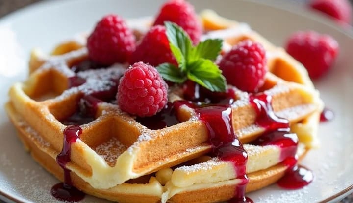 Raspberry Brie Grilled Waffles are savory and sweet gourmet comfort food featuring crispy waffles stuffed with warm brie cheese, grilled to perfection with raspberry preserves. It’s a new take on brunch that is practically dessert and packs a punch of flavor. Whether you’re enjoying a cozy indulgence over the weekend or multifing your culinary skills in front of guests, this recipe will impress everyone. Raspberry preserves paired with brie will redefine waffles for everyone.