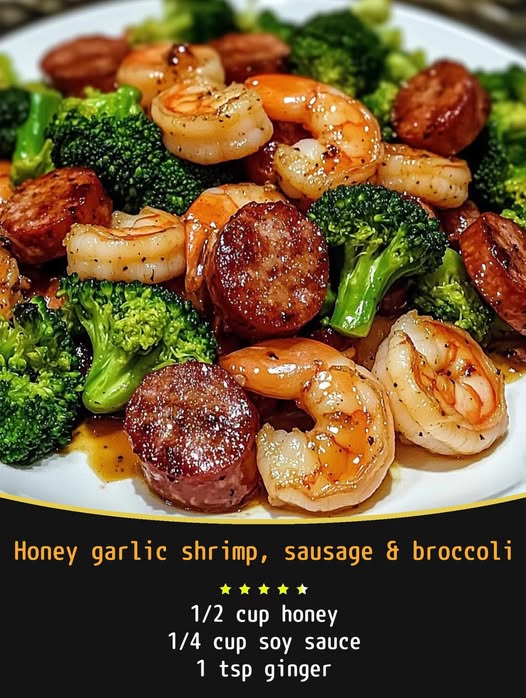 Combine Everything Return shrimp and sausage to the pan. Pour in the honey garlic sauce, toss to coat, and cook for another 2β3 minutes until everything is glazed and heated through.