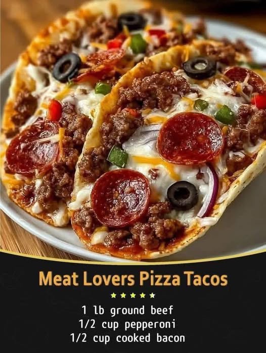 Meat Lovers Pizza Tacos are a bold, cheesy fusion of two comfort food favorites—pizza and tacos. They feature crispy or soft tortillas filled with rich pizza sauce, melted cheese, and a hearty mix of meats like pepperoni, sausage, and ground beef. The result is a handheld, flavor-packed meal that’s perfect for family dinners, game nights, or quick cravings.