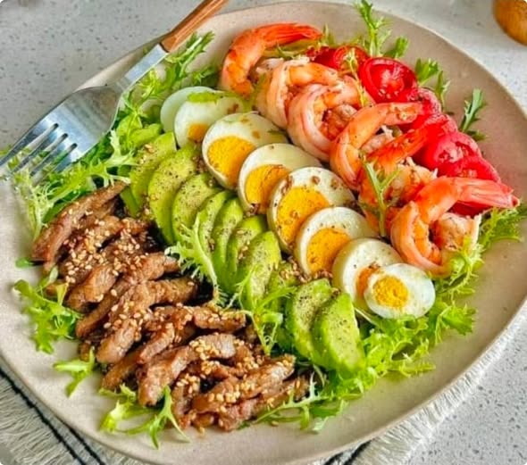 This Power Protein Salad with Shrimp, Egg, Avocado & Sesame Beef is the ultimate energy-boosting meal — loaded with lean protein, healthy fats, and fresh greens. Perfect for keto, low-carb, or high-protein diets, this colorful salad combines juicy shrimp, tender sesame beef, creamy avocado, and soft-boiled eggs for a nutrient-packed dish that’s both satisfying and delicious.