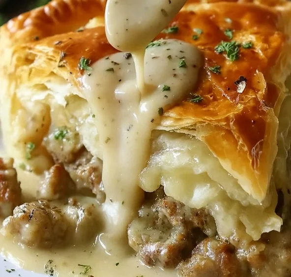 • Gently press puff pastry into the dish, leaving some overhang. Fill with sausage gravy.