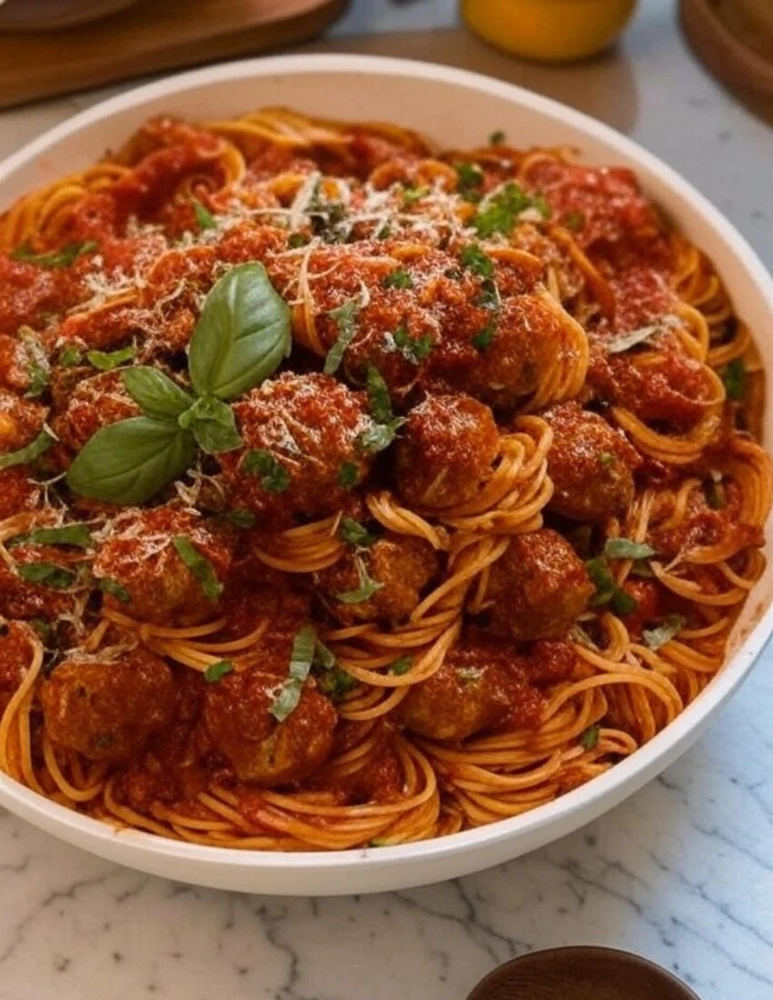 This dish brings together all the best parts of a cozy pasta night — juicy, flavorful meatballs, a garlicky tomato sauce, and spaghetti that soaks it all up. It’s hearty, family-friendly, and always a hit.