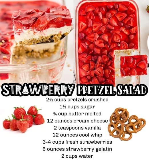 Strawberry Pretzel Salad is a nostalgic, crowd-pleasing layered dessert featuring a buttery pretzel crust, creamy cheesecake-style filling, and a fresh strawberry gelatin topping. The sweet, salty, creamy, and fruity layers create the perfect balance — making it ideal for potlucks, holidays, BBQs, and family gatherings.