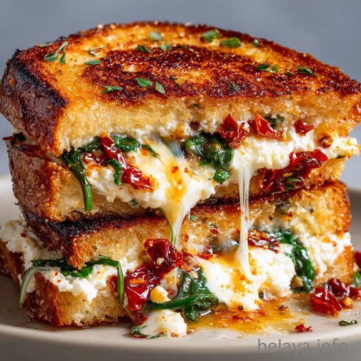 This isn’t your average grilled cheese. The creamy ricotta, tangy sun-dried tomatoes, sautéed spinach, and melty mozzarella make this sandwich a true flavor bomb. It’s rich, savory, slightly sweet, and crispy on the outside—perfect for lunch, dinner, or even brunch with a side salad or tomato soup.