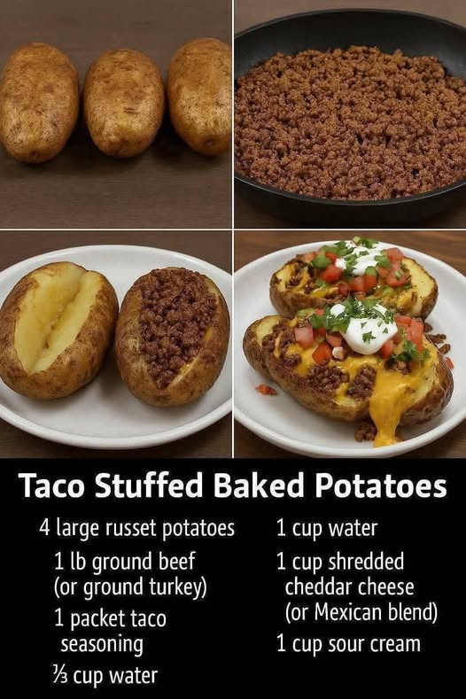 A fun and hearty twist on taco night! These baked potatoes are loaded with seasoned taco meat, melty cheese, and all your favorite taco toppings—comfort food meets Mexican flair.