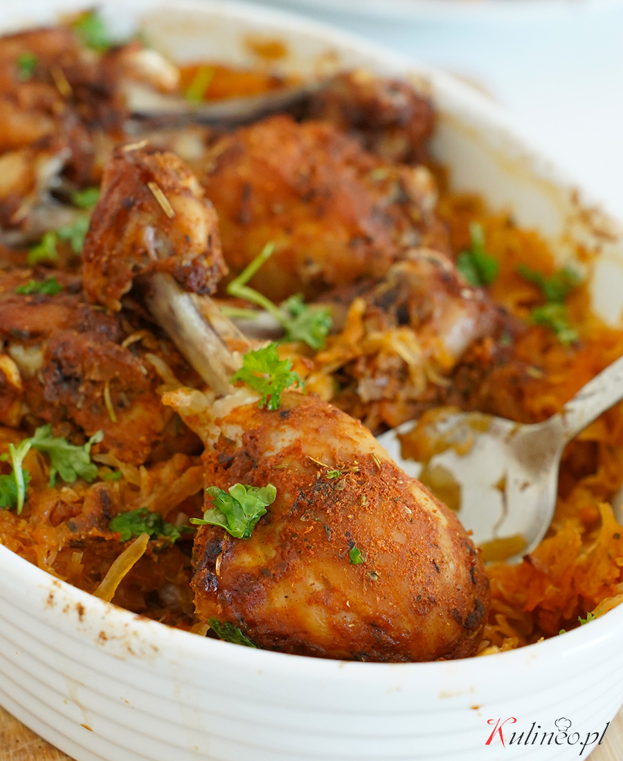 Do naczynia żaroodpornego przełóż warstwę kapusty. Na wierzchu ułóż przyprawione pałki z kurczaka. - Pieczenie: